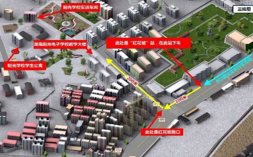 学校地址:湖南省长沙市雨花区车站南路红花坡路176号。 (可以百度地图搜索:湖南阳光电子学校,即可找到我校位置)